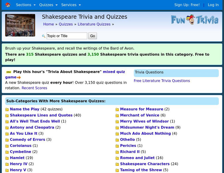 On this site, Shakespearean quizzes and Shakespearean trivia collections are found. There are 29 folders of content associated with Shakepeare plays and facts.