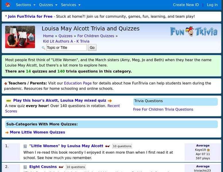 This site shares a collection of quizzes to assess the writings of Louisa May Alcott.