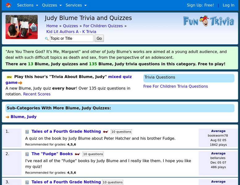 This FunTrivia provides seven modules of timed quizzes over several of Judy Blume's books. Students will be able to review the answer main idea and detail questions over the following works by the Newbery Award winner, Beverly Cleary:...