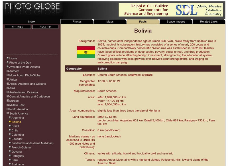 Presents many general country specific facts about Bolivia in a well organized chart form. This site is enriched by links to maps and an image of the Altiplano salt flats.