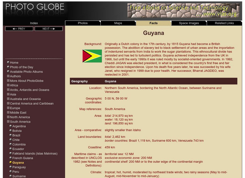 Offers general country specific facts about Guyana in a well organized chart form. Content includes: geography, people, government, economy, communications, transportation, military, and transnational issues. This site is enriched by a...