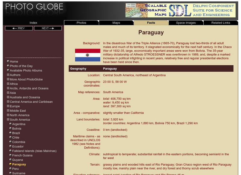 Provides many general country facts about Paraguay in a well organized chart form. Content includes: geography, people, government, economy, communications, transportation, military, and transnational issues. This site is enriched by a...