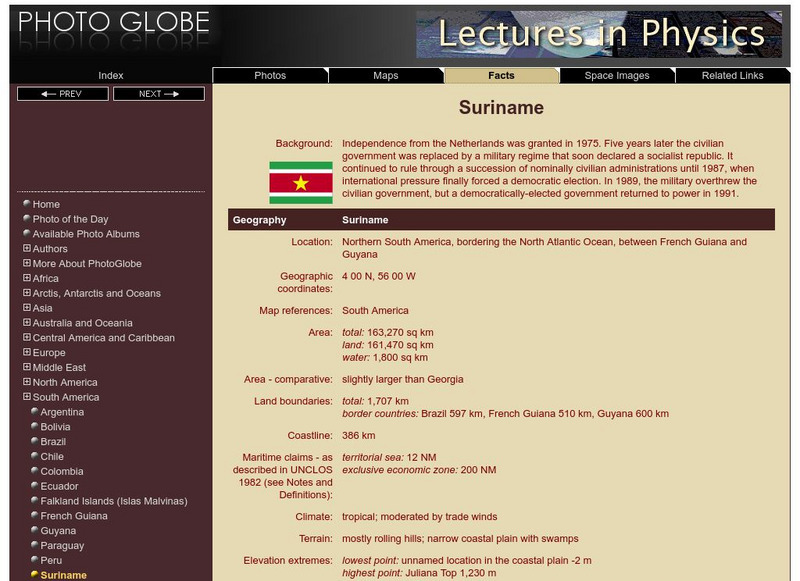 Examines general country specific facts about Suriname in a well organized chart form. Content includes: geography, people, government, economy, communications, transportation, military, and transnational issues. This site is enriched by...