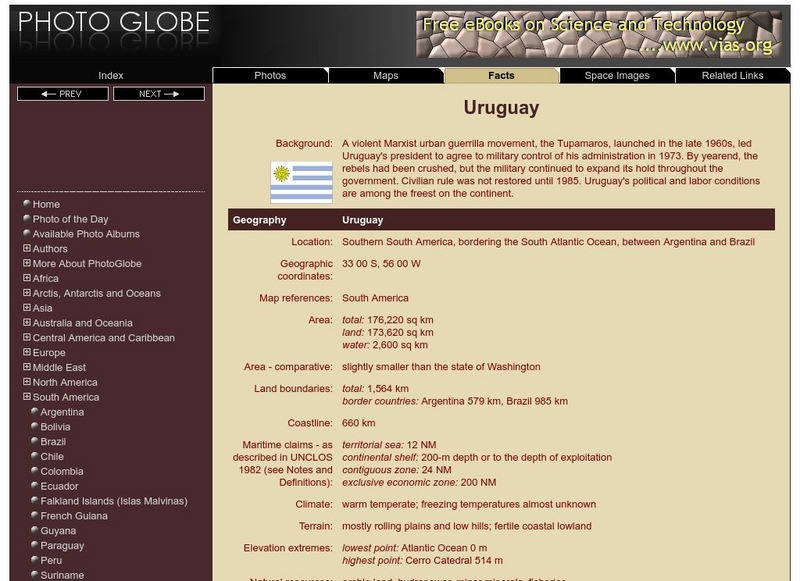 Explores general country facts about Uruguay in a well organized chart form. Content includes: geography, people, government, economy, communications, transportation, military, and transnational issues. This site is enriched by links to...