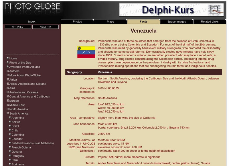 Presents many general country specific facts about Venezuela in a well organized chart form. Content includes: geography, people, government, economy, communications, transportation, military, and transnational issues. This site is...