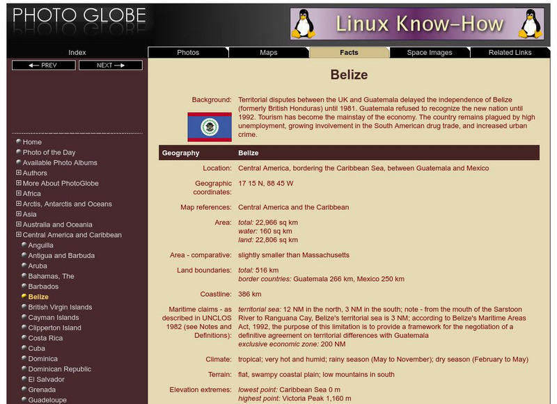 Provides many general country facts and statistics about Belize in a well organized chart form. This site is enriched by links to maps and an image of its flag.