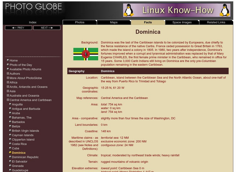 Presents background and general country facts and figures about Dominica in a well organized chart form. This site is enriched by links to maps and an image of its flag.