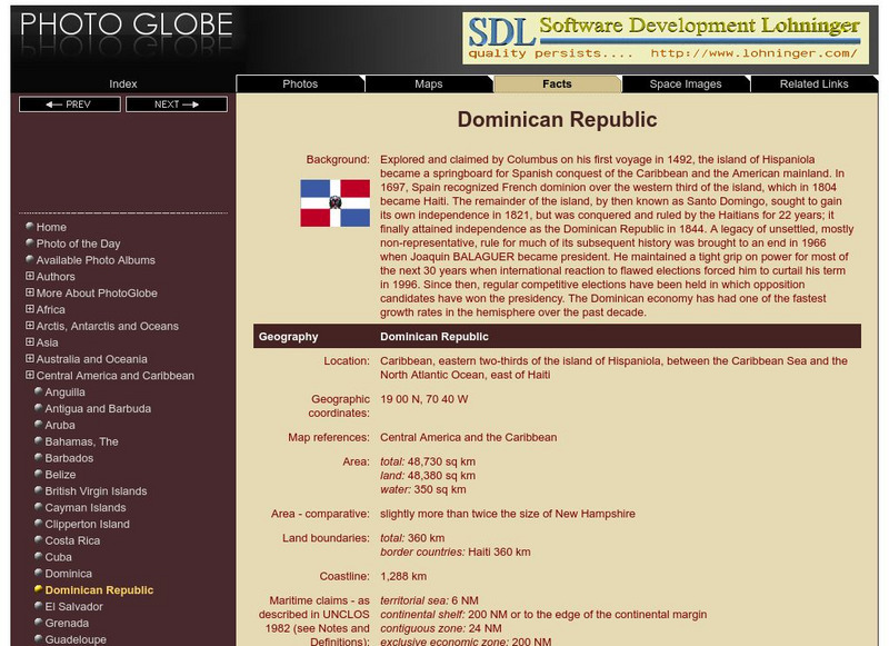 Offers background as well as many general country facts and statistics about the Dominican Republic in a well organized chart form. This site is enriched by links to maps and an image of its flag.