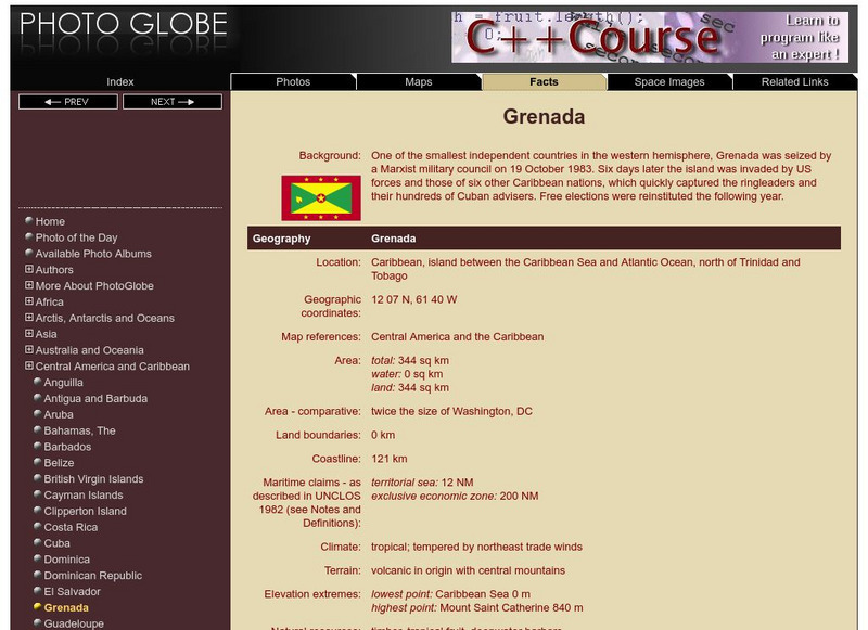 Provides many general country facts and statistics about Grenada in a well organized chart form. This site is enriched by links to maps and an image of its flag.