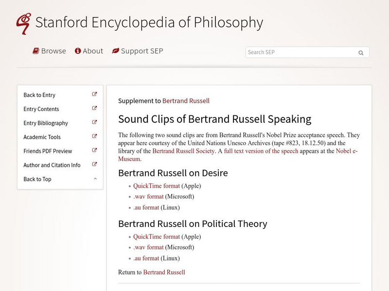 Downloads a 53 second Real Audio sound clip of philosopher Bertrand Russell reading his work "Desire."