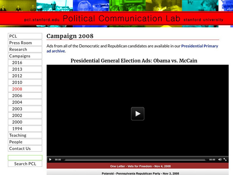 Watch a collection of presidential 2008 campaign ads from Barack Obama and John McCain at this resource. Also links to different campaign ads dating back to 1994.