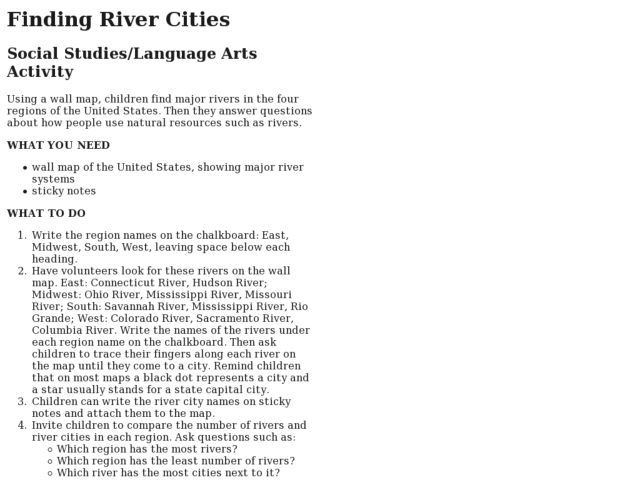 Using a wall map, students will find major rivers in the four regions of the United States. Then they answer questions about how people use natural resources, such as rivers.