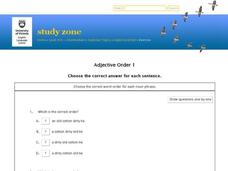 In this adjective order worksheet, students must choose the correct order of adjectives from four given choices. Students must determine the proper order of four adjectives for each question.