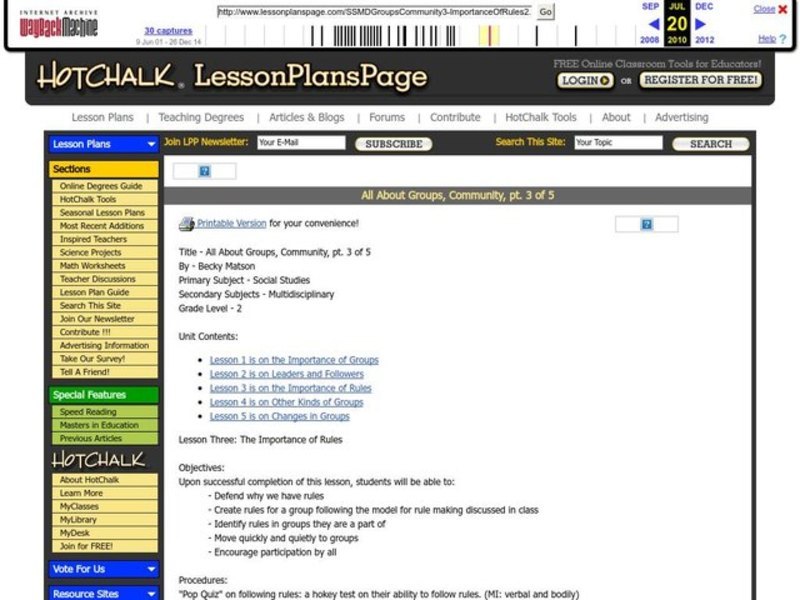 Second graders examine the kinds of rules that different groups have. They work cooperatively in small groups to make rules for different groups and complete a worksheet imbedded in this plan. They have a greater understanding why rules are necessary.