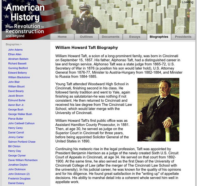Provides a biography about the life of the 27th President of the United States, William Howard Taft.