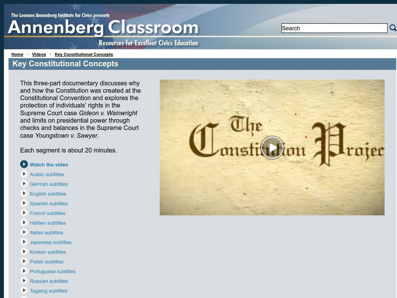 This three-part documentary discusses why and how the Constitution was created at the Constitutional Convention and explores the protection of individuals' rights in the Supreme Court case Gideon v. Wainwright and limits on presidential power through checks and balances in the Supreme Court case Youngstown v. Sawyer. Each segment is about 20 minutes.