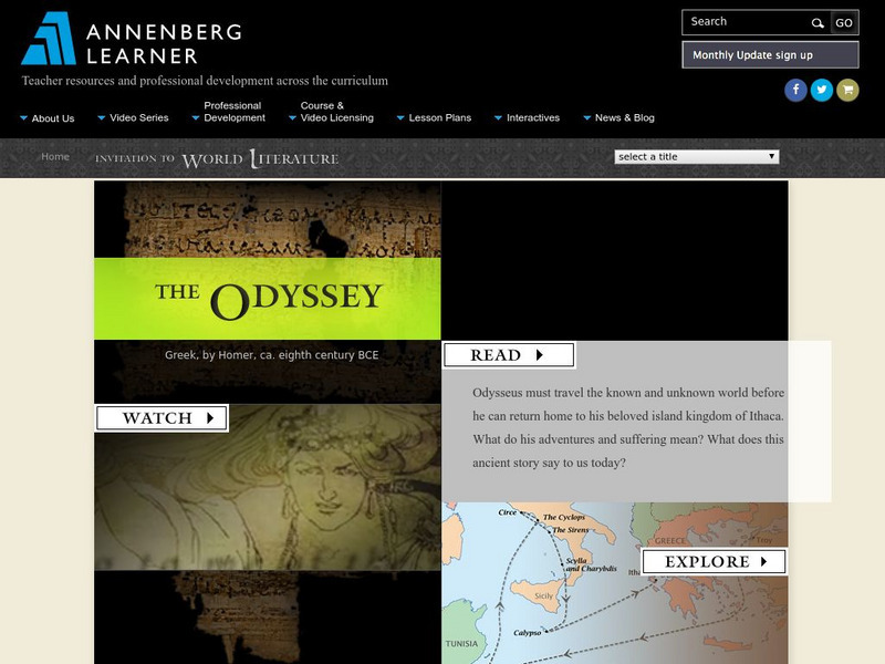Lesson from a multimedia course on literary world classics considers Homer's Odyssey. Lesson centers on a half-hour video offering multiple perspectives on the work. Read an excerpt from The Odyssey and find dozens of rich and varied sidebars, a slideshow, a timeline, a map, and expert commentaries. Key points for discussion, a glossary, notes on the language of Homer, notes on characters in the work, and other useful features aid analysis and appreciation.