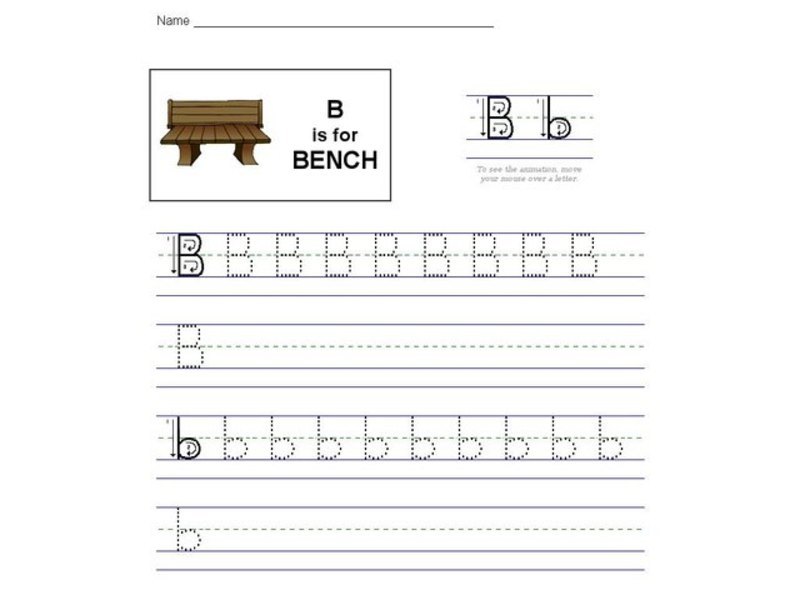 In this printing practice worksheet, students follow the dotted lines to form the letters B and b. They print two rows of each. They can see an animation of how to form each letter if they look at the worksheet online before printing it for the practice portion.