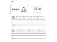In this printing practice worksheet, students follow the dotted lines to form the letters B and b. They print two rows of each. They can see an animation of how to form each letter if they look at the worksheet online before printing it for the practice portion.