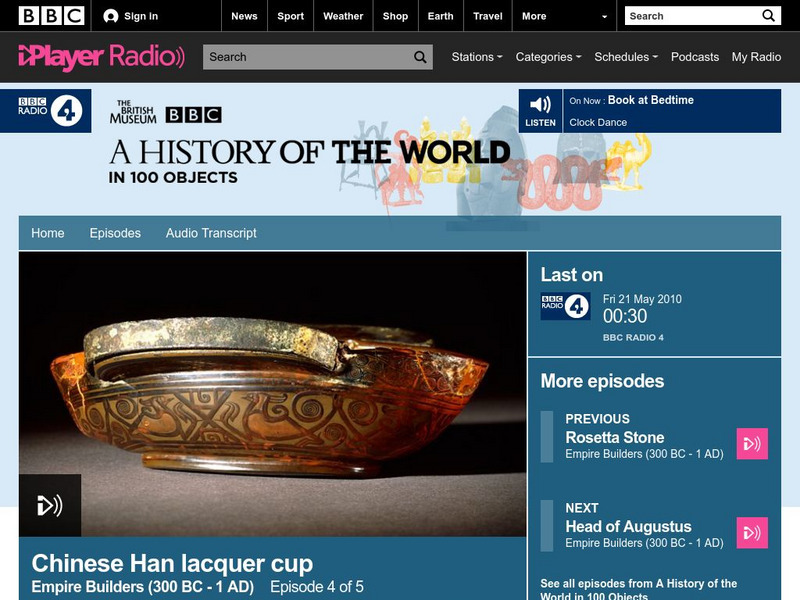A lacquer cup made on the orders of the Chinese Han dynasty emperor. Neil MacGregor, Director of the British Museum, tells the story of the cup, most probably given by the emperor to one of his military commanders in North Korea, and how the Chinese maintained loyalty and control by dispensing luxury gifts. The historian Roel Sterckx underlines the importance of lacquer for the period, while writer Isabel Hilton looks at how the production of goods under state control has remained a consistent interest of the Chinese. (Duration: 15 mins)