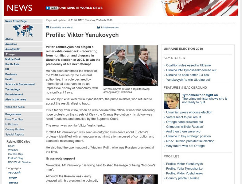 This profile discusses Viktor Yanukovich's political career, focusing specifically on his comeback from Ukraine's Orange Revolution. (March 2, 2010)