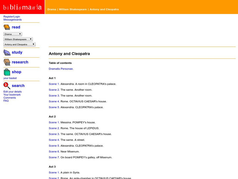 Here, read the full text of Shakespeare's tragedy, "Antony and Cleopatra." Text is divided by scene.