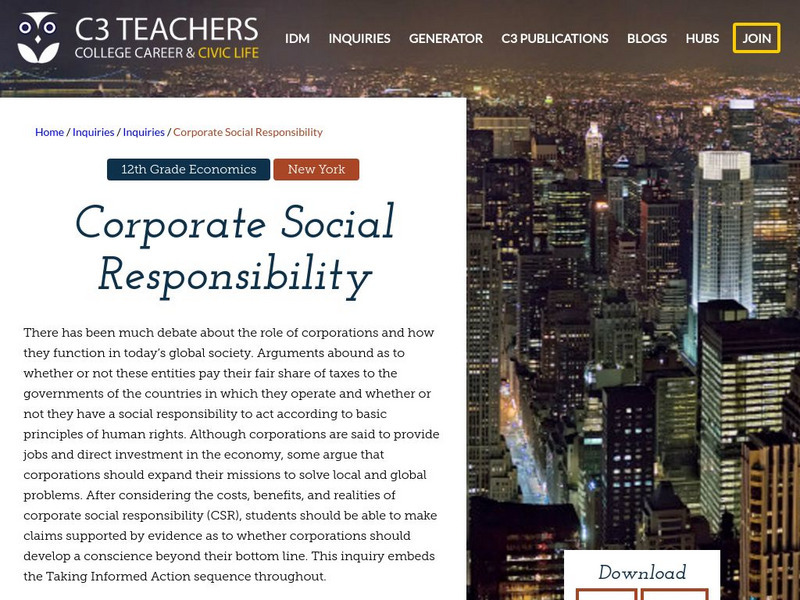 A learning module on whether corporations should take on more responsibility for combating societal problems. It includes several supporting questions accompanied by formative tasks and source materials, followed by a summative performance task. Topics covered include what corporate social responsibility is, its benefits, and potential problems with it. The module can be downloaded in PDF or DOC format.
