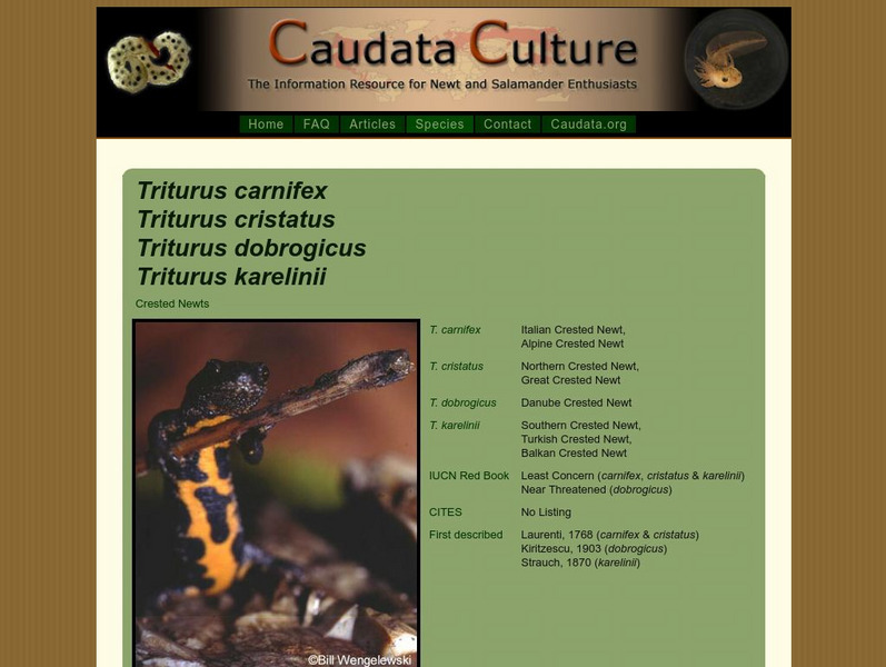 This site describes the four species of crested newts, including information regarding their range and hatitat, and the similarities and differences of the species.