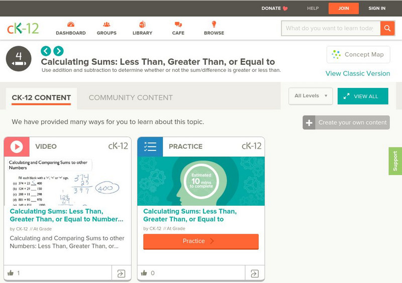 [Free Registration/Login may be required to access all resource tools.] Locate the video "Calculating Sums: Less Than, Greater Than, or Equal to Numbers (Numbers to 1,000)." In this learning module, students must add or subtract to find a number greater or less than the target number. The process is explained in the accompanying video. [0:37] A set of practice questions is provided for self-assessment.