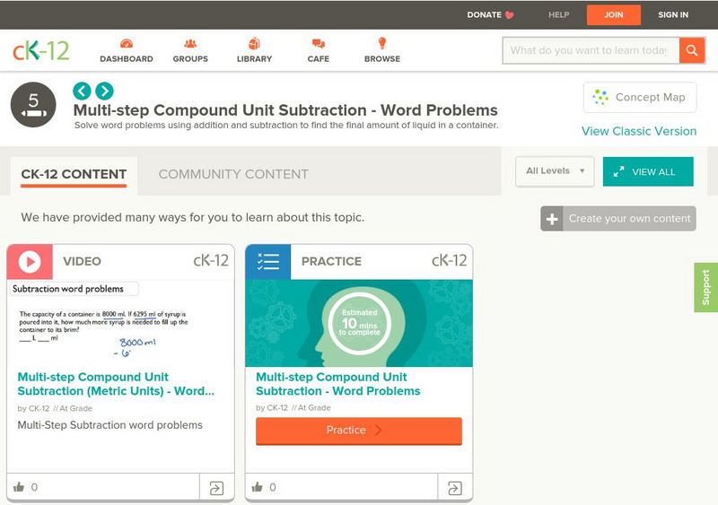 [Free Registration/Login may be required to access all resource tools.] For this learning module, students are asked to subtract compound metric units of capacity to find the difference. Includes video demonstrating a sample problem [1:46] and a set of practice questions.
