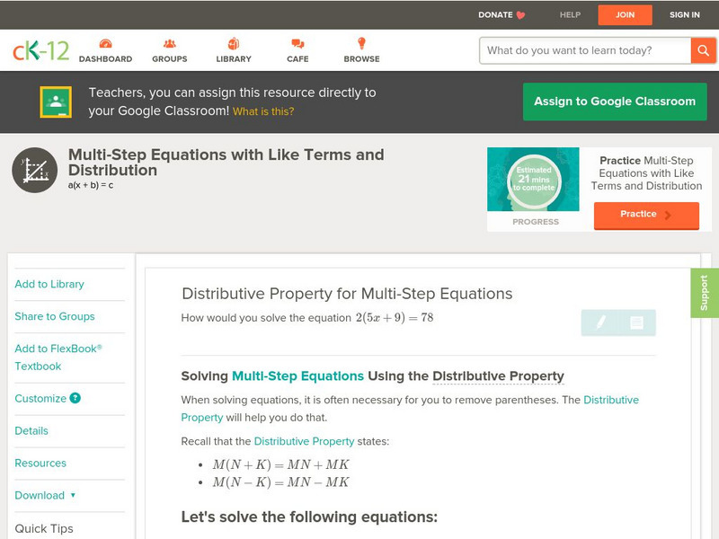 [Free Registration/Login may be required to access all resource tools.] Students learn how to solve multi-step problems using the Distributive Property. Students examine guided notes, review guided practice, watch instructional videos and attempt practice problems.