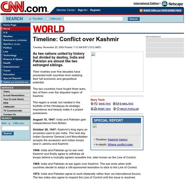 An excellent, easy-to-understand timeline of the conflict between Indian and Pakistan over Kashmir, the root of the problem. Timeline covers conflict from 1947 to November 2003.