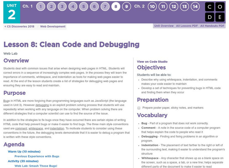 Students deal with common issues that arise when designing web pages in HTML. Students will correct errors in a sequence of increasingly complex web pages. In the process they will learn the importance of comments, whitespace, and indentation as tools for making web pages easier to read. At the end of the lesson students create a list of strategies for debugging web pages and ensuring they are easy to read and maintain.