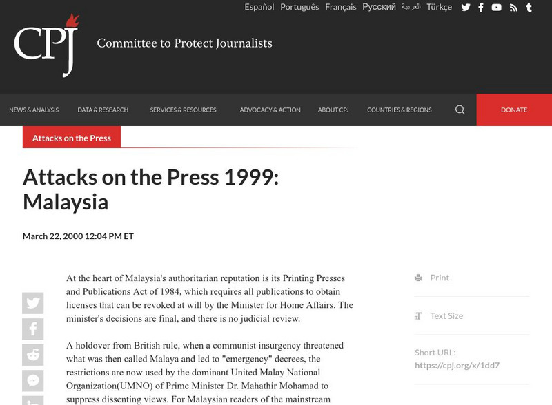 A view of the authoritarian reputation of the Malaysian government as an example of the government's control of mass communications illustrated in their Printing Presses and Publications Act of 1984. Read how this law is used to dominate and suppress dissenting views. Cites specific news stories which validate the review.