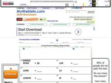 For this converting Roman numbers to whole numbers worksheet, students convert Roman numerals to one-digit and two-digit numbers. Students solve 20 problems.