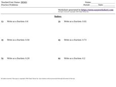 In this Algebra I learning exercise, 9th graders convert decimals to fractions. The one page learning exercise contains six questions. Answers are not included.