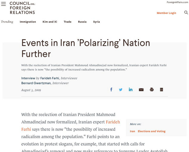 This August 3, 2009 interview with Farideh Farhi a political science professor from the University of Hawaii examines the impact of Iranian President Ahmadinejad's reelection on Iran and the possible responses of the Obama Administration.