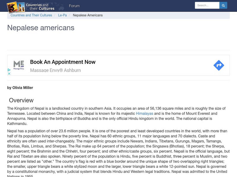 asian american, world culture encyclopedia: multicultural america: nepalese americans, assimilation of nepalese americans, celebrations of nepalese americans, costumes of nepalese americans, customs and traditions of nepalese americans, diet of nepalese americans, education of nepalese americans, employment of nepalese americans, family dynamics of nepalese americans, history of nepal, language of nepalese americans, marriage and nepalese americans, music of nepalese americans, religion of nepalese americans, role of women and nepalese americans