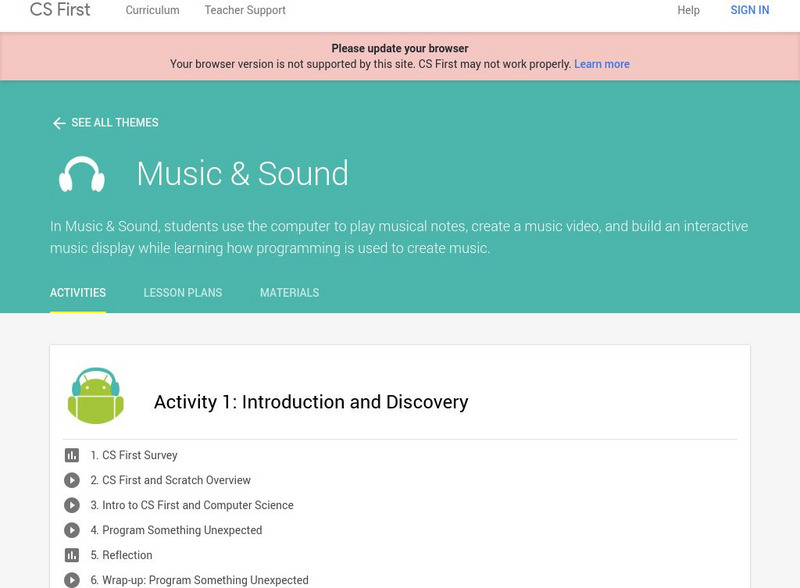 A set of eight activities that teach students basic computer science concepts using the programming language Scratch. Includes lots of additional supports for teachers. All materials are free and teachers sign in to create a class. This unit focuses on the theme of music and sound. Students use programming as they learn how to play music and make a music video and a music display.
