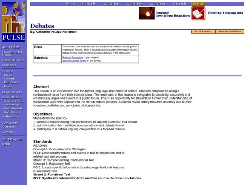 Students conduct research using multiple sources to support a position in a debate. They put information from multiple sources into correct debate format. Students participate in a debate arguing one position in a focused manner.
