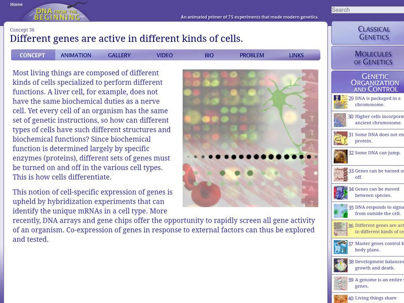 Many scientists have worked on discovering what genes are "turned on" within cells at different stages of development. DNA arrays and gene chips are techniques that have been developed. This article will help you understand these difficult concepts. Article includes animations, pictures, video, biographical information, and quiz questions that are accessed by clicking on buttons along the bottom of the page.