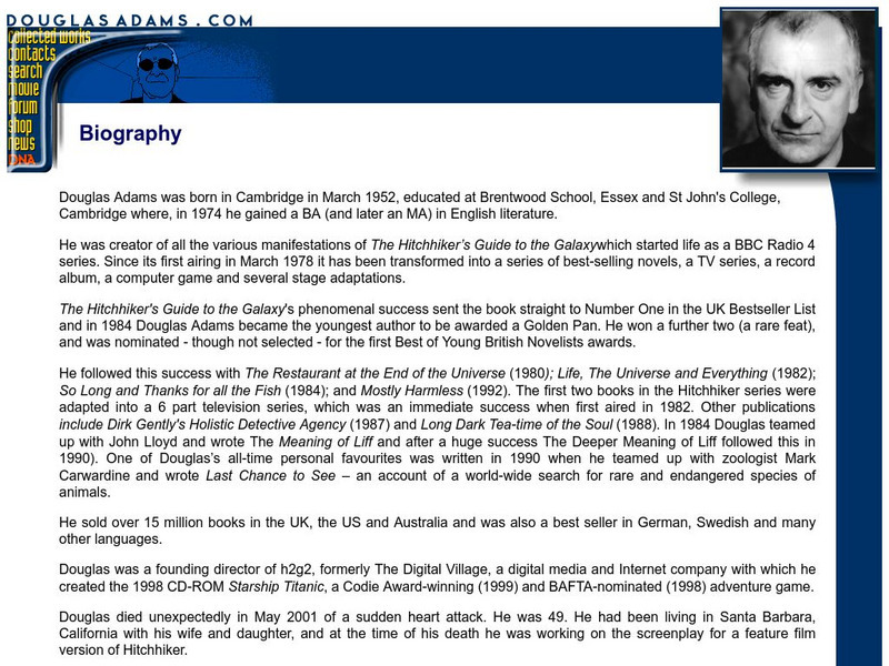This section of the Douglas Adams site features a biography of Adams (1952-2001 CE), as well as several articles and a short story by Adams. "The Private Life of Ghengis Khan," is a treat for readers who have read only Douglas' novels.