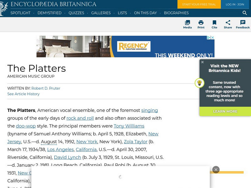 This entry from Encyclopedia Britannica features the Platters, an American vocal ensemble, one of the foremost singing groups of the early days of rock and roll and also often associated with the doo-wop style.