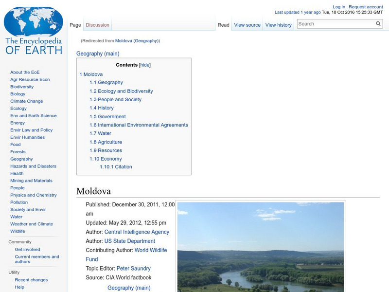 The Encyclopedia of Earth provides an overview of Moldova, including its geography, natural resources, history, government, economy, and much more. Maps and images are also included, along with sources used to create the entry.