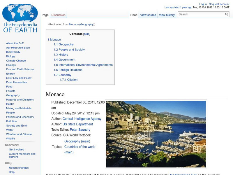 The Encyclopedia of Earth provides an overview of Monaco, including its geography, natural resources, history, government, economy, and much more. Maps and images are also included, along with sources used to create the entry.