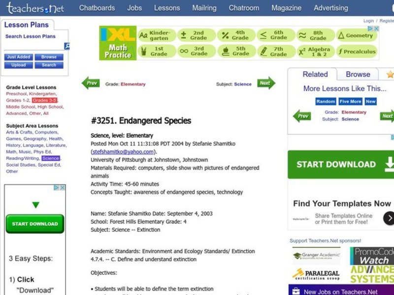 Students define extinction, name four animals and two plant species that are extinct, list three reasons why animals and plants become extinct, and create ways that would help prevent extinction.