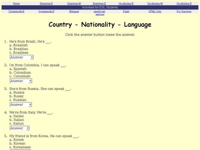 In this ESL country/nationality/language worksheet, students match descriptions of people and the countries they are from to their language or nationality. Students may click on an answer button for immediate feedback.