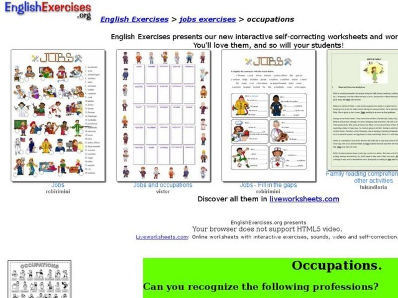 In this ESL occupations instructional activity, students click on icons to listen to a description of an occupation show in a picture and type the occupation, complete sentences and a crossword puzzle.