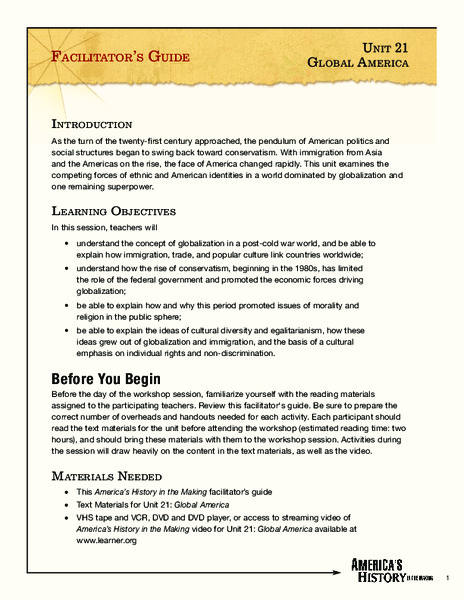 It's not really a small world after all! The 21st lesson of a 22-part series on American history researches the impact of globalization on the United States. Using photographic and written references materials, as well as video sources, groups research and present their findings on global America using graphic organizers and Venn diagrams.
