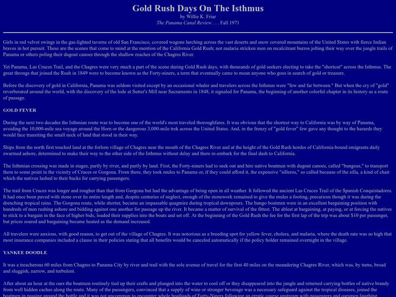 This page is an article entitled "Gold Rush Days On The Isthmus", by Willie K. Friar, from "The Panama Canal Review" (Fall 1971). Read about this significant event in Panamanian history, which falls into the "Independence" years (1849-1851).
